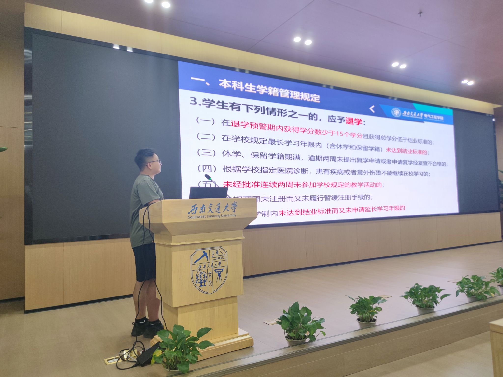 最后,赵娜老师对本次本科生相关管理规章制度学习进行总结。赵娜老师表示,大学为同学们的自我探索提供了广阔的舞台和丰富的资源,但同学们务必走出“上了大学就轻松了”、“六十分万岁”等认知误区。唯有不懈努力、持之以恒,用实际行动感悟“厚德载物,求是创新”的电气精神,才能真正走好自己的大学之路。
