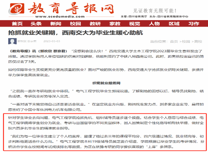 扎实的就业工作取得了突出的工作成效,学院在2023年就业考核中获评一等奖,就业工作在《教育导报网》、四川新闻联播《稳就业·一线调查》等媒体报道, 樊芝菱也先后三次获“雷竞技raybet登录入口就业工作先进个人(综合奖)”荣誉称号。