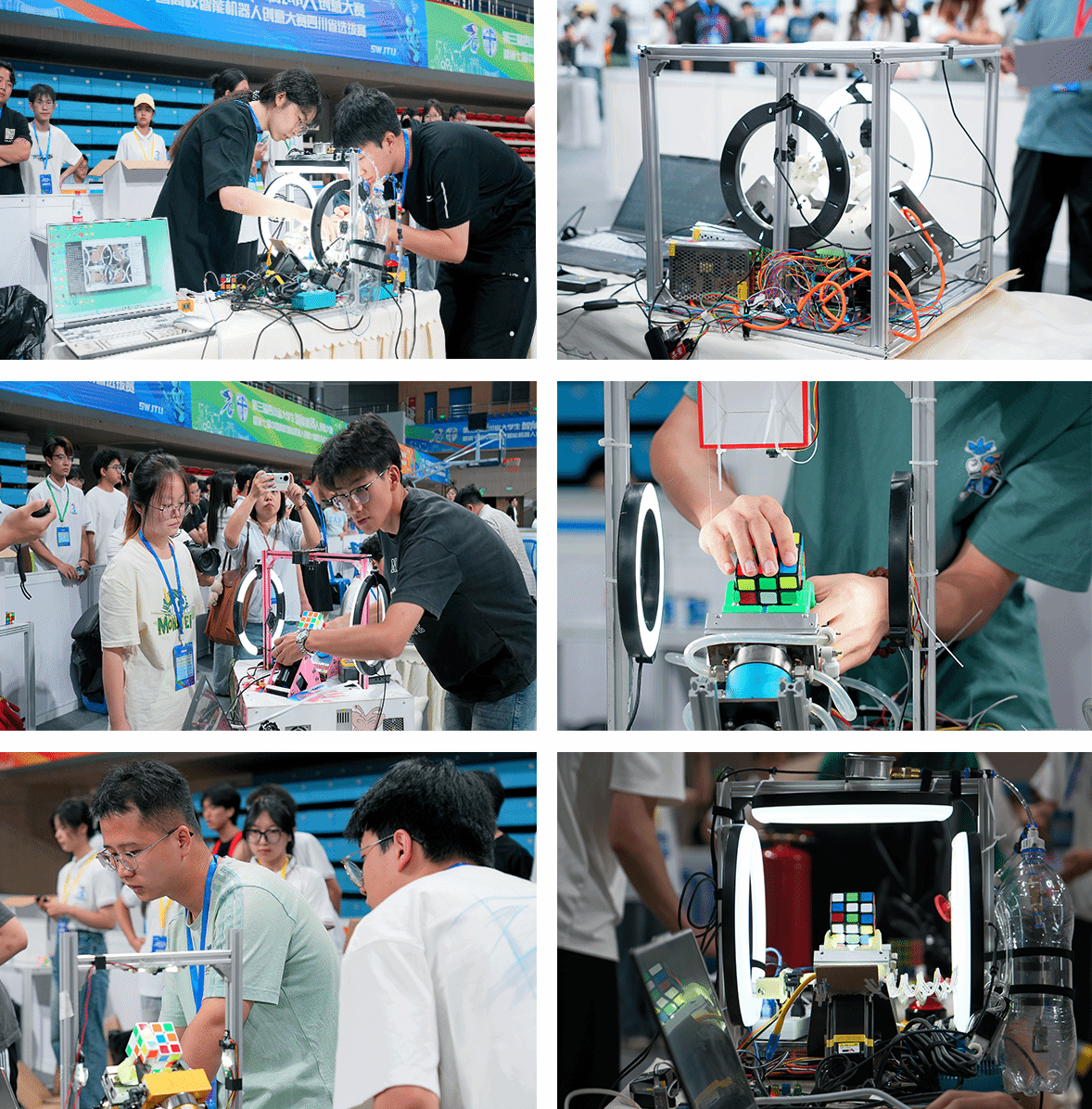 魔方机器人竞赛,是一场速度与智慧的较量。参赛队伍以“挑战更快”为目标,将机械、电子、信息等多学科知识巧妙融合,打造出超越人类反应速度的魔方还原机器人。在比赛现场,选手们紧张调试代码、沉着操作设备,控制机器人飞速翻转魔方。